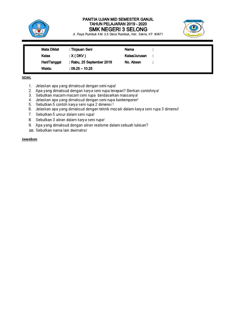 Contoh Soal Seni Budaya Kelas 10 X Sma Ma Smk Semest from www.seputarpengetahuan.co.id Maybe you would like to learn more about one of these? We did not find results for: Check spelling or type a new query.